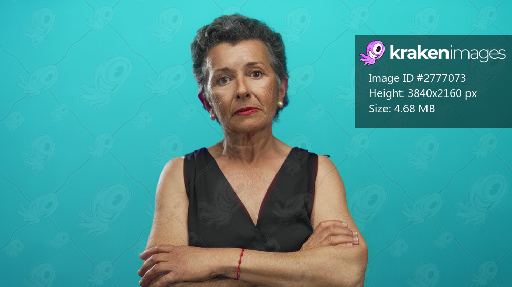 Senior woman with grey hair and folded arms stands against a vibrant blue background, embodying a contemplative mood in a studio setting.