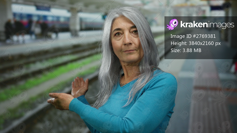 Senior woman with grey hair gestures at a bustling railway platform in an outdoor train station showcasing travel and transit culture.