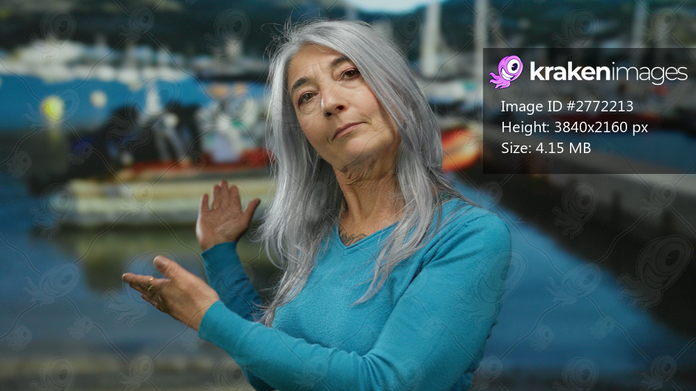 Senior woman with grey hair gestures at a scenic seaside port with boats in the background, capturing an outdoor moment with a vibrant atmosphere