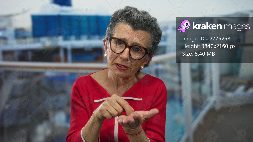 Senior woman with grey hair gestures for money aboard a boat at sea, wearing a red shirt and glasses against a blurred nautical background, indicating a request for financial help outdoors. - Kraken Images