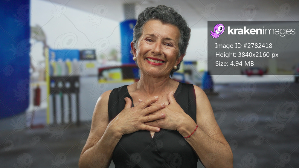 Senior woman with grey hair gestures joyfully outside at a petrol station, highlighting an engaging and cheerful moment in an outdoor setting.