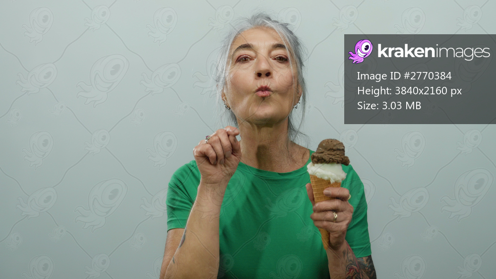 Senior woman with grey hair gestures while holding chocolate and vanilla ice cream against isolated white background wearing green shirt.