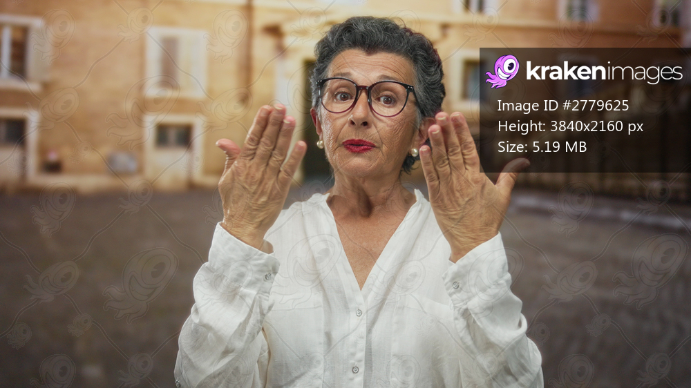Senior woman with grey hair gesturing in an urban old town street, wearing glasses and a white shirt, captured in a lively city setting outdoors.