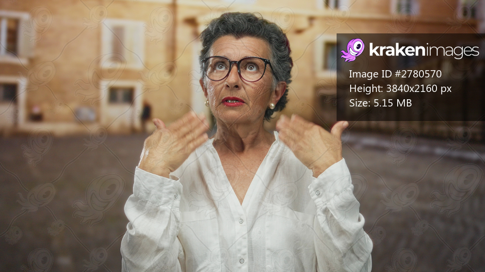 Senior woman with grey hair gesturing in an urban old town street, wearing glasses and a white shirt, captured in a lively city setting outdoors.