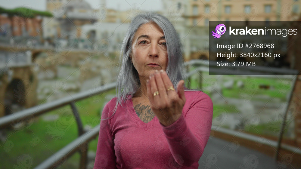 Senior woman with grey hair gesturing in front of roman ruins in rome, showcasing ancient architecture and cultural heritage in an outdoor setting.