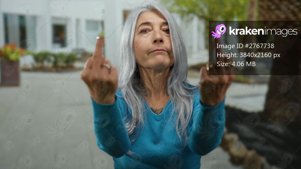 Senior woman with grey hair gesturing with middle fingers in urban outdoor setting wearing blue top.