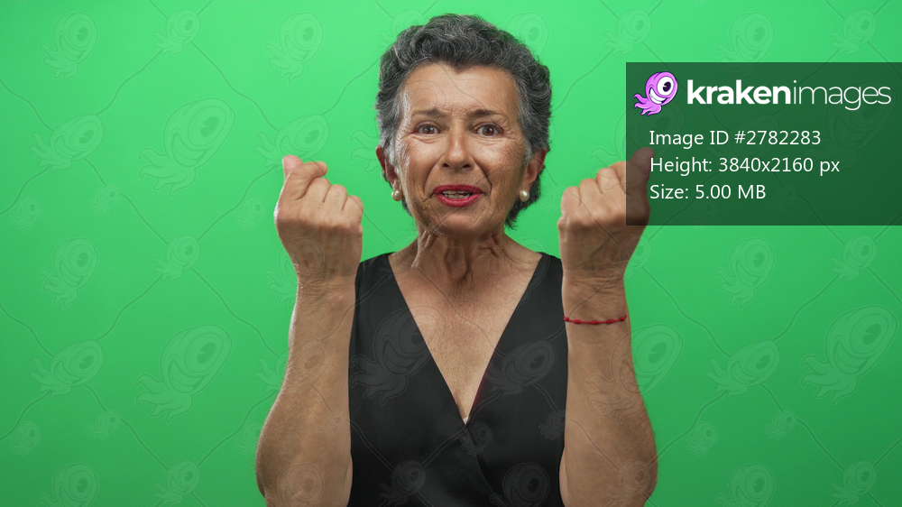 Senior woman with grey hair gesturing money with fingers against a vibrant green background, showing an expression of optimism and success, emphasizing wealth and positivity. - Kraken Images