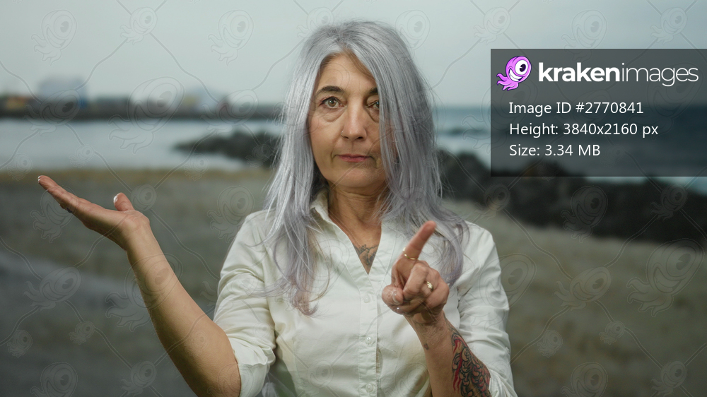 Senior woman with grey hair gesturing no with finger while presenting something at the beach, capturing a serene outdoor seaside scene.