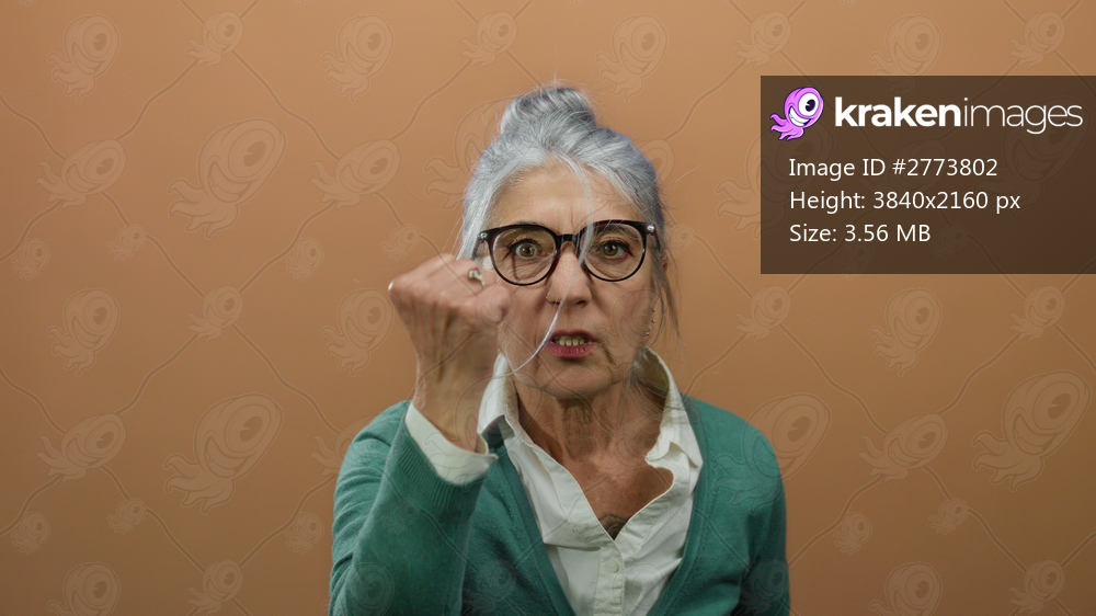 Senior woman with grey hair and glasses expresses anger with a clenched fist against an isolated brown wall background, wearing a green sweater.