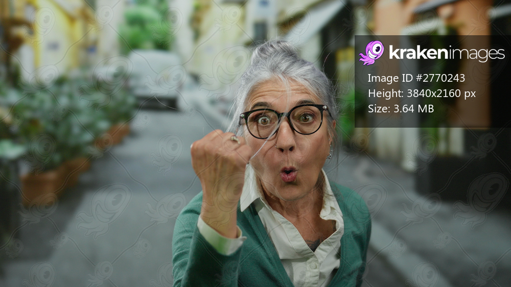 Senior woman with grey hair and glasses expressing anger on an outdoor urban street with colorful buildings in the background.