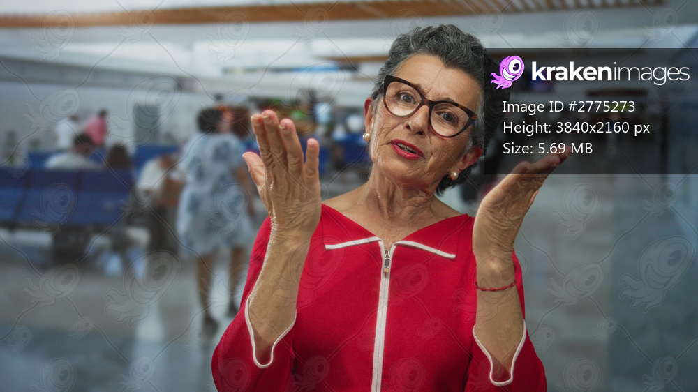 Senior woman with grey hair and glasses gesturing happily indoors at a bustling airport terminal in a vibrant red outfit surrounded by blurred travelers and blue seating - Kraken Images
