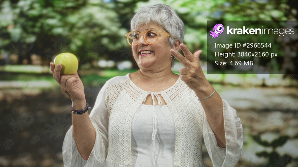 Senior woman with grey hair and glasses holding a green apple, wearing a white blouse, points two fingers and smiles broadly in forest; joyful confidence. - Kraken Images