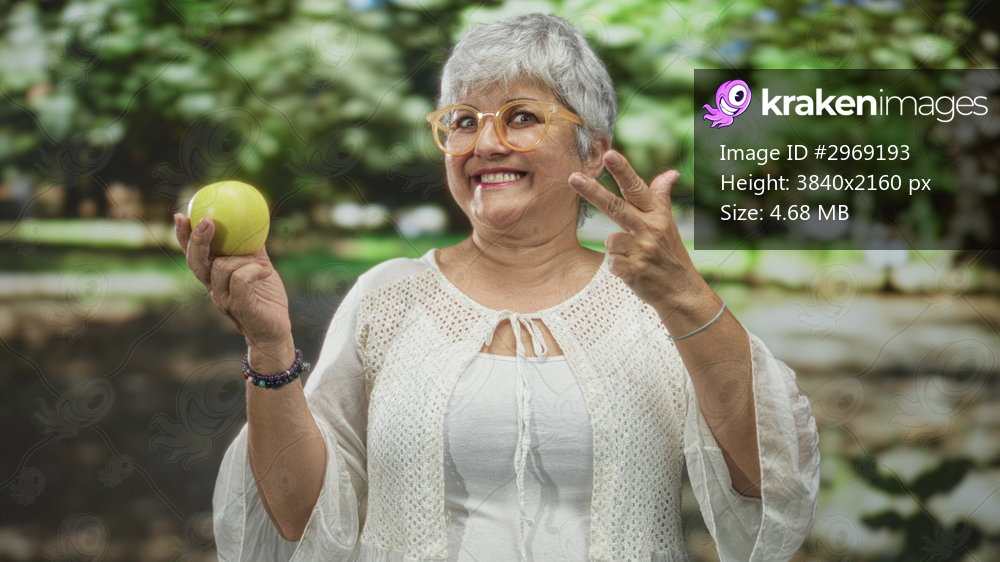 Senior woman with grey hair and glasses holding a green apple, wearing a white blouse, points two fingers and smiles broadly in forest; joyful confidence. - Kraken Images