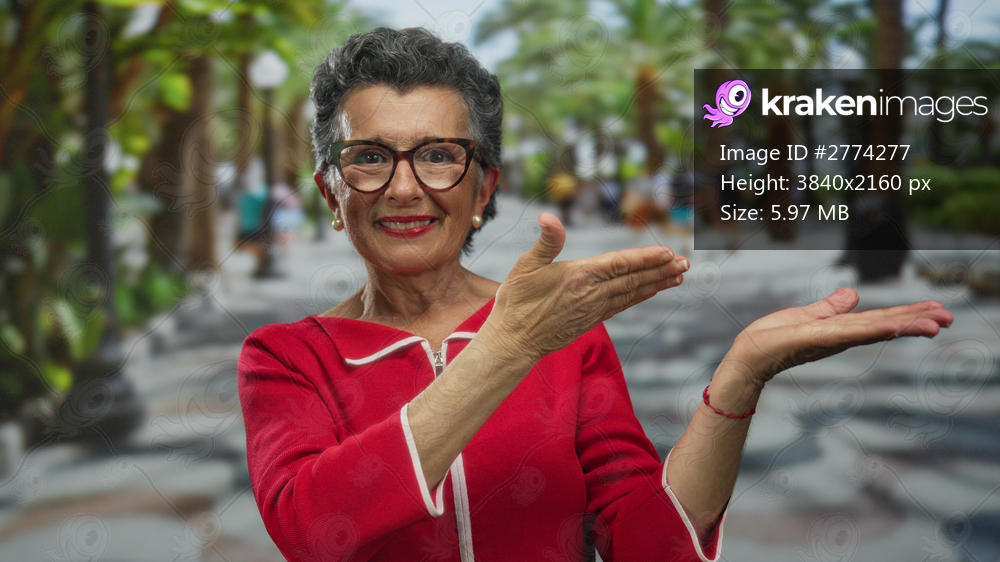 Senior woman with grey hair and glasses in red dress smiling and gesturing outdoors on a sunny urban street indicating presentation or welcoming context. - Kraken Images