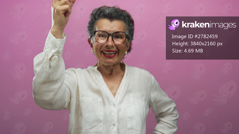 Senior woman with grey hair and glasses in white shirt smiles confidently against a pink background, showing enthusiasm and positivity.