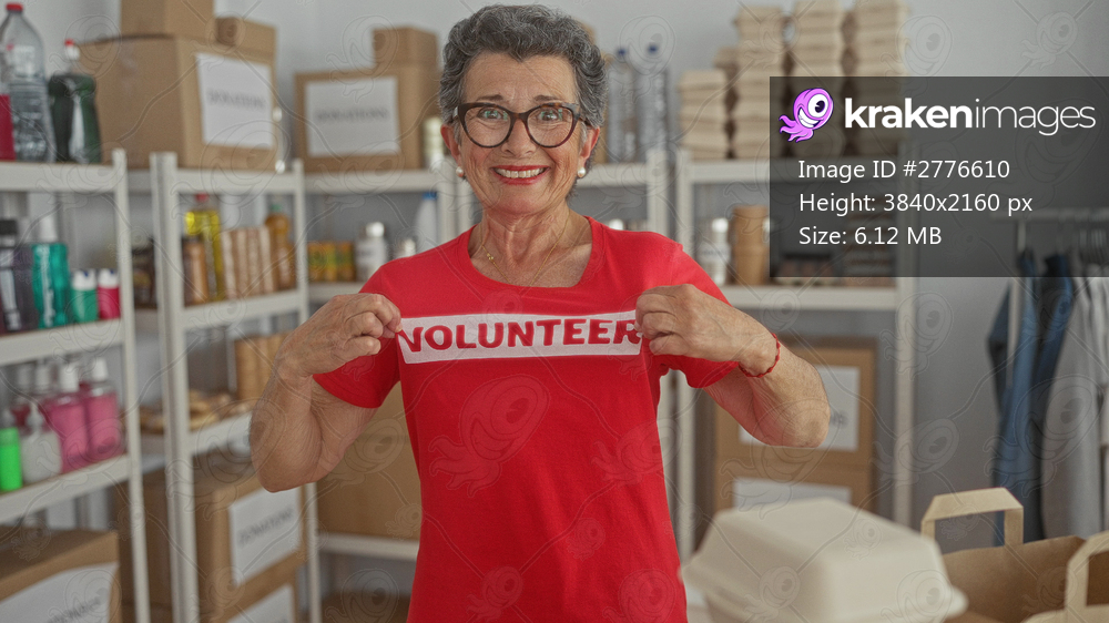 Senior woman with grey hair and glasses proudly wearing a red volunteer shirt in a organized donation room with shelves filled with boxes and supplies. - Kraken Images