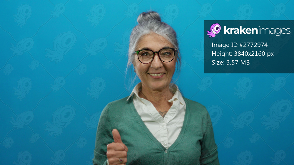 Senior woman with grey hair and glasses smiles giving thumbs up against blue background suggesting positivity and approval.