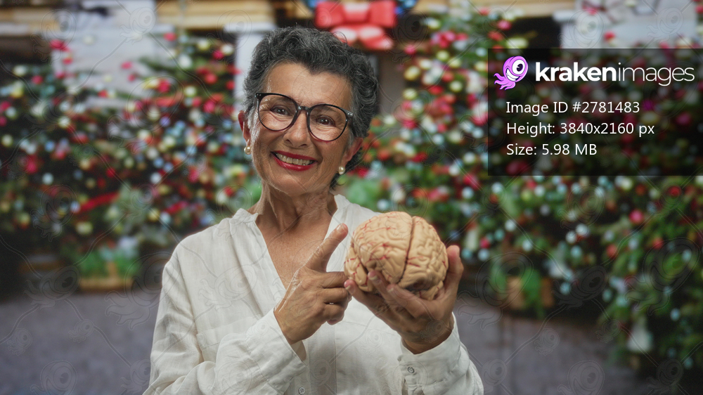 Senior woman with grey hair and glasses smiles outdoors holding a brain model, surrounded by urban christmas decorations on a festive city street.