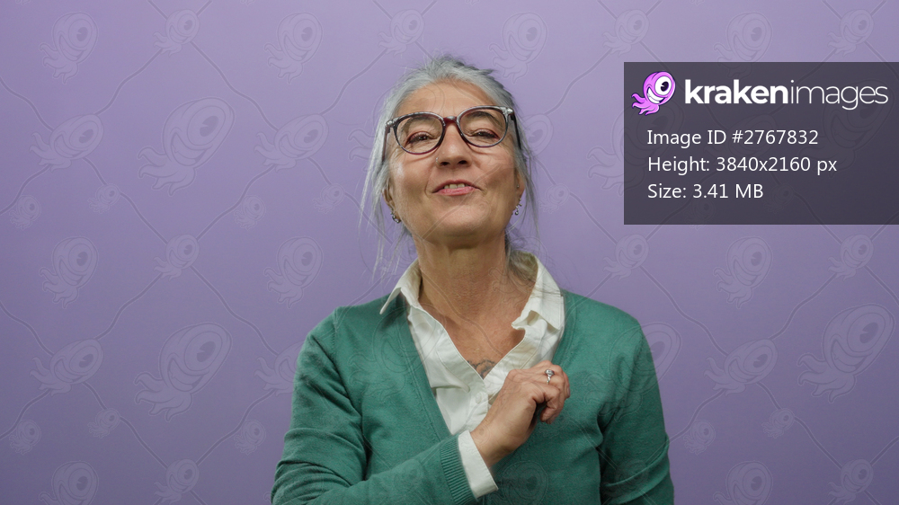 Senior woman with grey hair and glasses smiling against a purple background, conveying confidence and friendliness in an isolated setting.