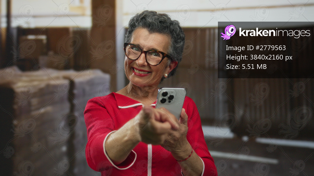 Senior woman with grey hair and glasses, smiling and pointing smartphone in construction site indoors, showcasing technology engagement and joy.