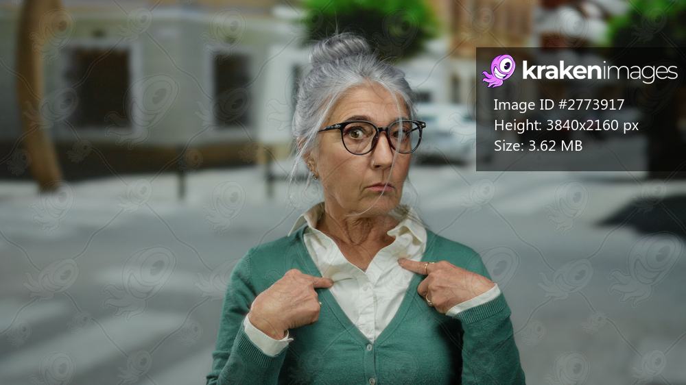 Senior woman with grey hair and glasses stands outdoors on a street in a city setting, expressing surprise or confusion while pointing at herself.