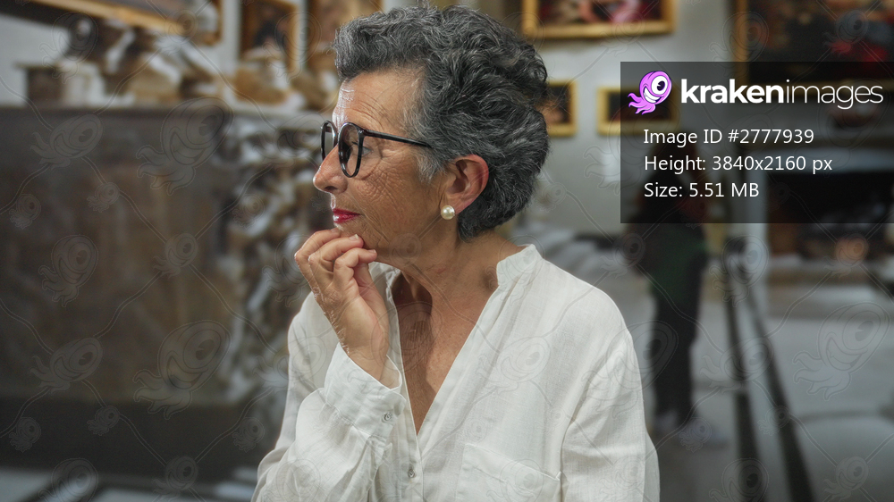 Senior woman with grey hair and glasses stands thoughtfully in an art gallery, surrounded by paintings and sculptures, wearing a white blouse and pearl earrings in a contemplative pose. - Kraken Images