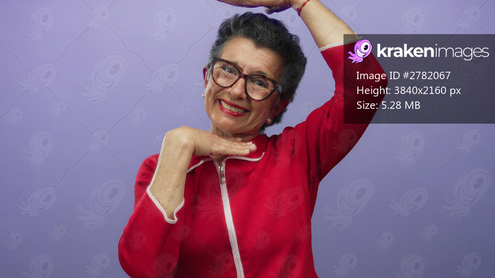 Senior woman with grey hair and glasses wearing a red sweater makes a framing gesture with hands against a purple background, expressing joy and creativity in a studio setting. - Kraken Images