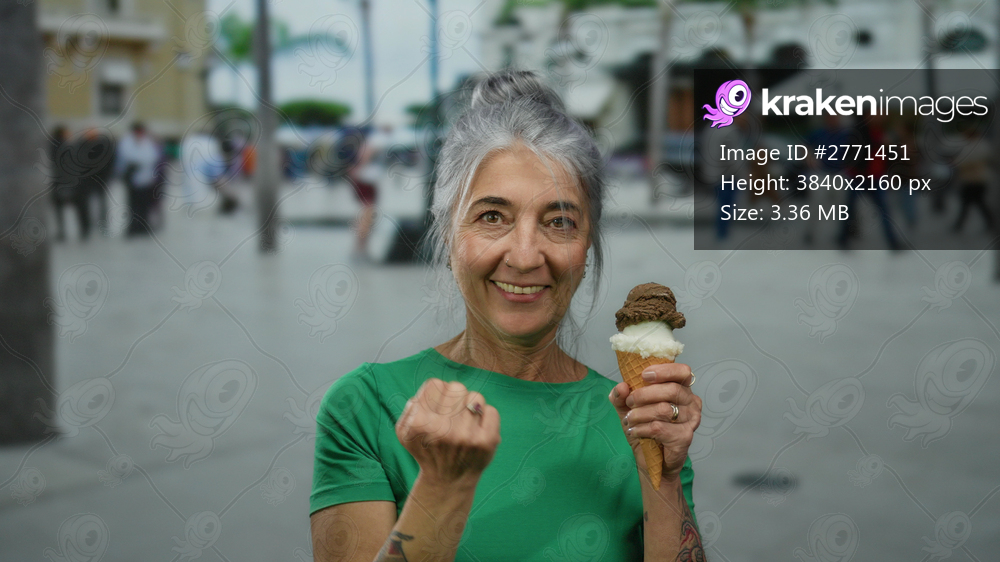 Senior woman with grey hair happily enjoys ice cream on a busy street, embodying joy and savoring life outdoors with vibrant city life bustling around her. - Kraken Images