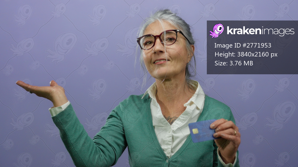 Senior woman with grey hair holding a credit card and gesturing something on an isolated purple background depicts finance concept