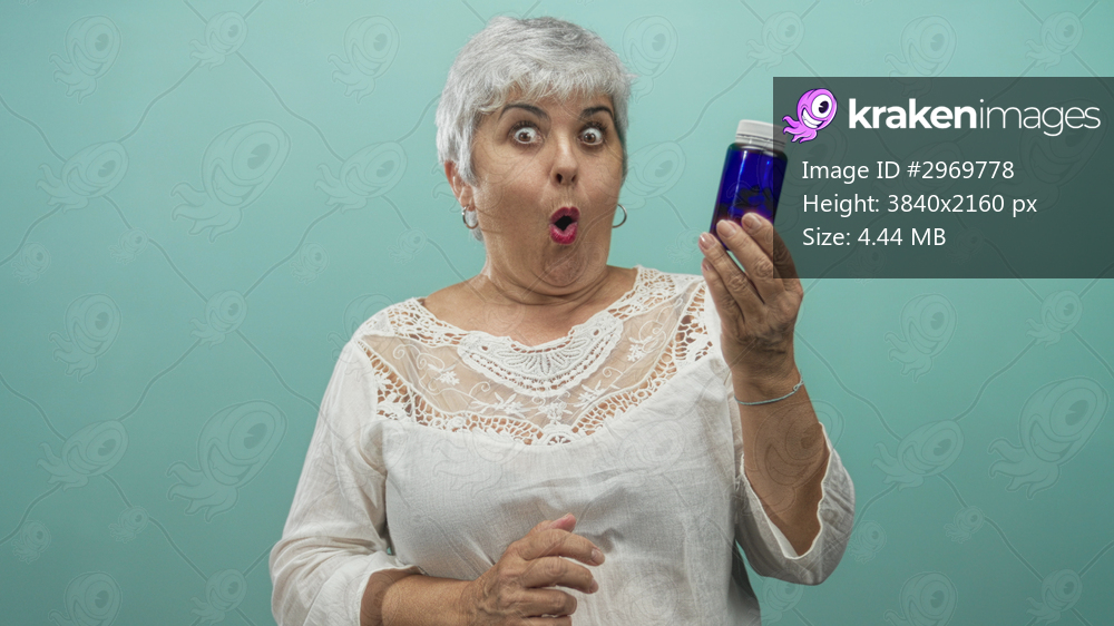 Senior woman with grey hair holding blue pill bottle in right hand and giving thumbs up while smiling in studio; relief health.