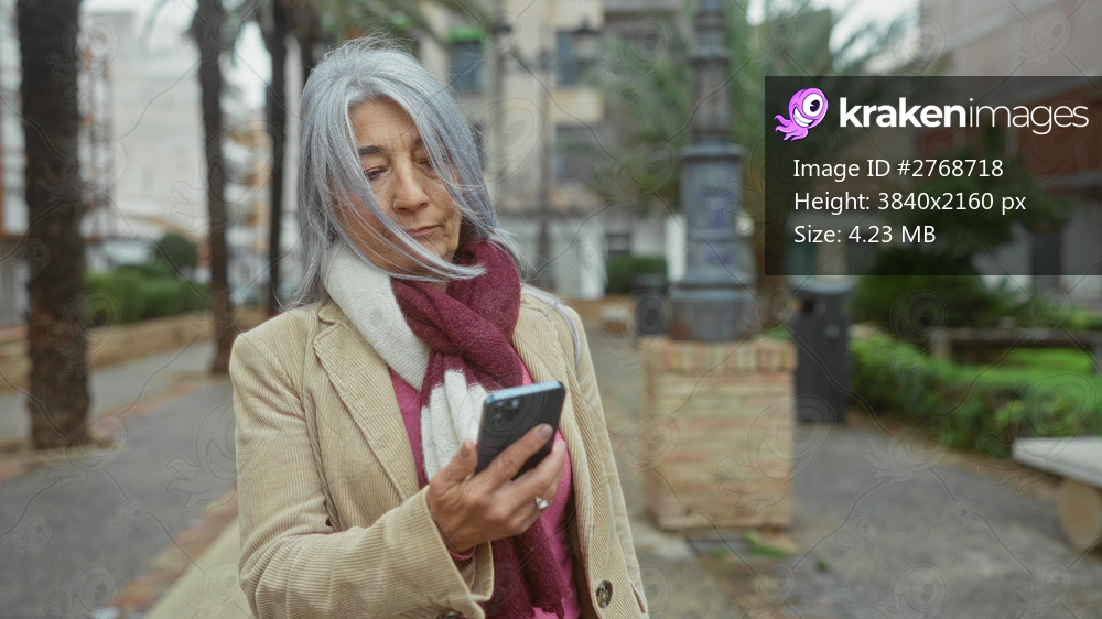 Senior woman with grey hair holding phone stands on palm-lined street, wearing coat and scarf, looking thoughtful, suggesting a modern urban lifestyle experience.