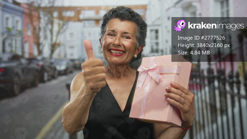 Senior woman with grey hair holds a pink gift box, smiling with a thumbs-up gesture in an urban street setting, showcasing joy and positivity outdoors. - Kraken Images