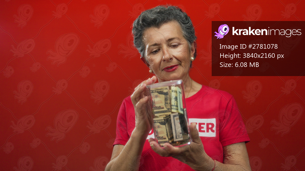 Senior woman with grey hair holds money jar while volunteering against a vibrant red background, showcasing charity and financial support themes.