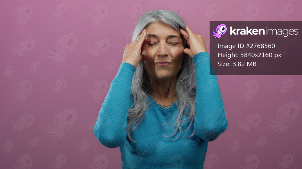 Senior woman with grey hair in a blue shirt touches her temples, appearing in pain against an isolated pink background, suggesting headache or stress relief. - Kraken Images