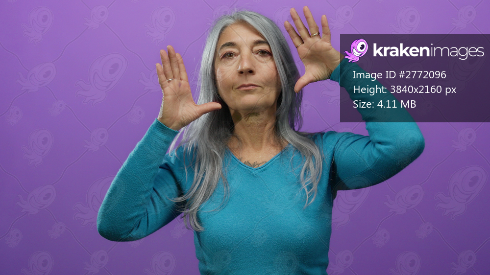 Senior woman with grey hair in a blue sweater poses against an isolated purple background, expressing with hands raised near her face.