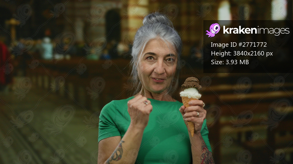 Senior woman with grey hair in a church enjoying ice cream, capturing a joyful and serene moment inside a sacred space with a vibrant and lively expression. - Kraken Images