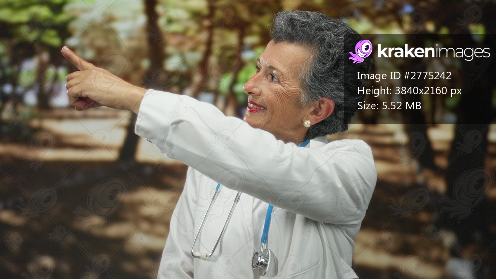 Senior woman with grey hair in a doctor coat pointing forward with a stethoscope around her neck, surrounded by green trees and plants in a sunlit park setting. - Kraken Images