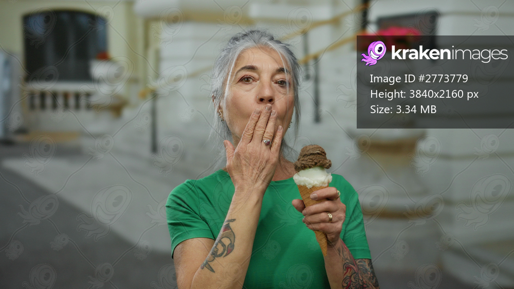 Senior woman with grey hair in a green shirt blows a kiss while holding an ice cream cone outdoors on a charming street.