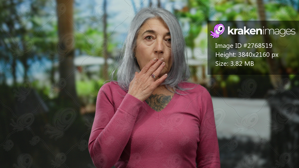 Senior woman with grey hair in a park setting outdoors expressing surprise or thoughtfulness, wearing a pink sweater against a lush green backdrop with trees and plants visible. - Kraken Images
