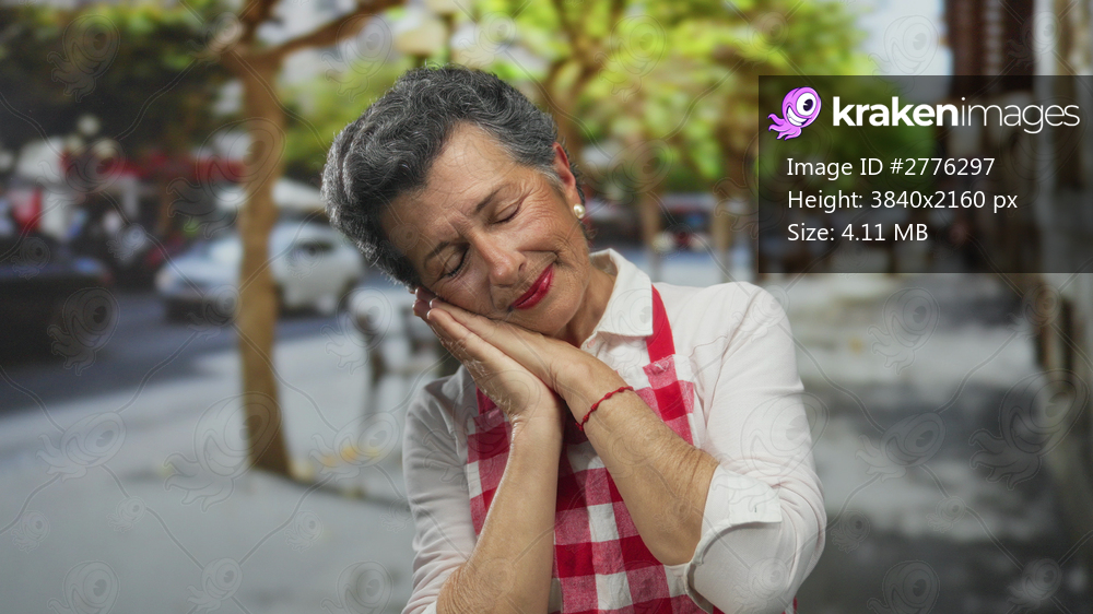 Senior woman with grey hair in a red checkered apron appearing relaxed and peaceful outdoors on a lively urban street.