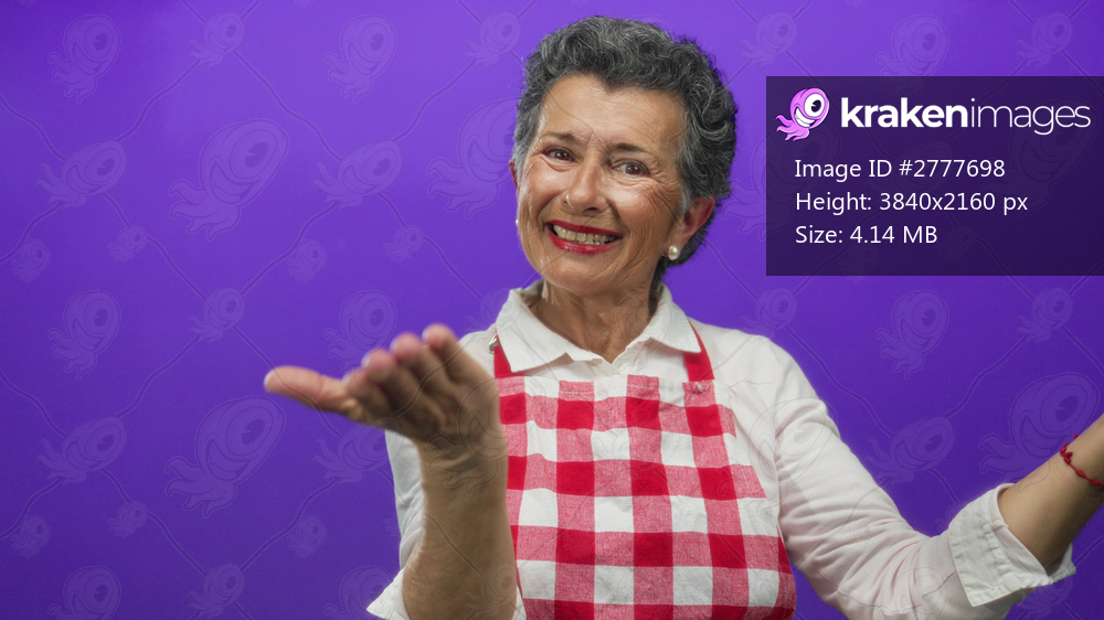 Senior woman with grey hair in a red checkered apron gestures happily against a vibrant purple background, exuding warmth and hospitality.