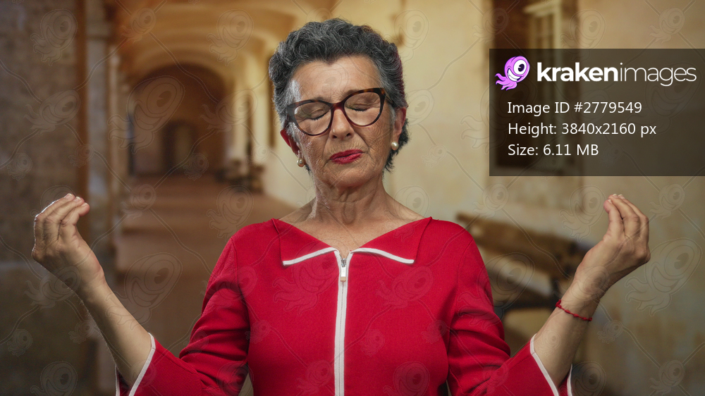 Senior woman with grey hair in a red dress meditates peacefully on an old town street, embodying tranquility in a serene outdoor urban setting.