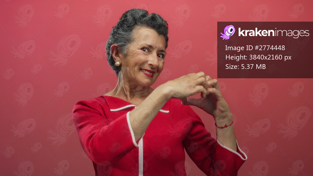 Senior woman with grey hair in a red outfit gesturing a heart with hands against a vibrant red background, radiating warmth and positivity, displaying charisma and elegance. - Kraken Images