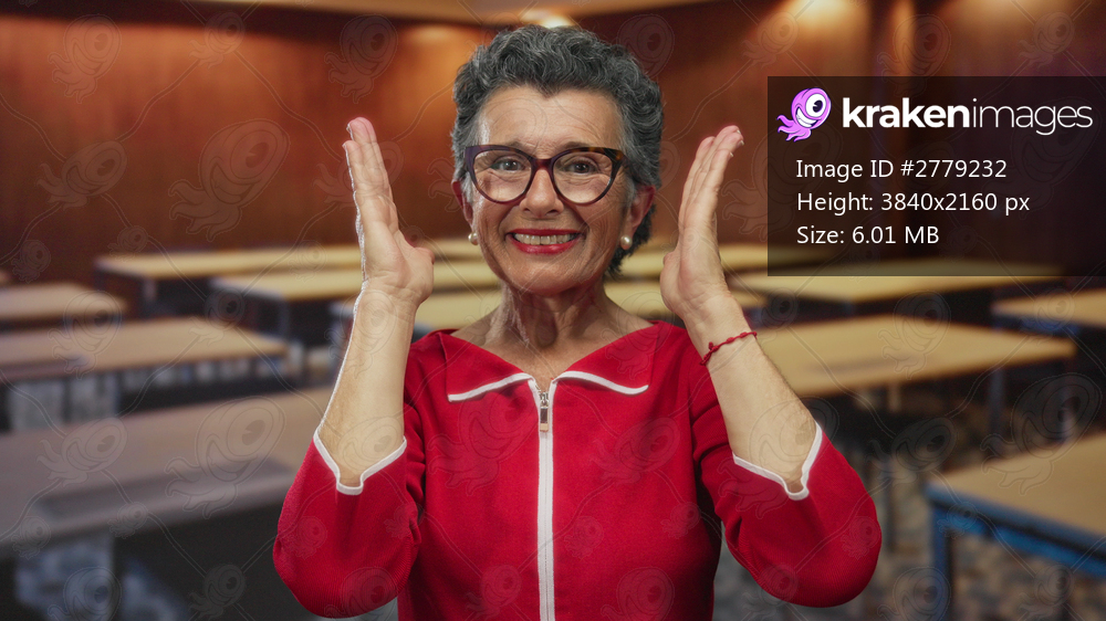 Senior woman with grey hair in a red outfit makes a framing gesture with hands inside a classroom filled with warm lighting and wooden tables, exuding a joyful expression. - Kraken Images