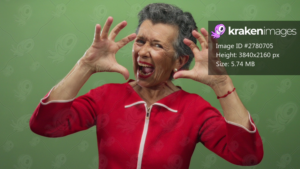 Senior woman with grey hair in a red outfit playfully roaring with clawed hands against a vibrant green background, exuding energy and enthusiasm.