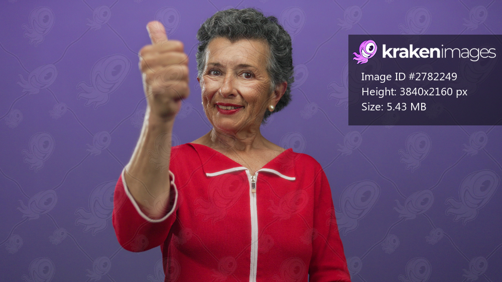 Senior woman with grey hair in a red outfit shows a positive thumbs-up gesture against a vibrant purple background, exuding confidence and joy.