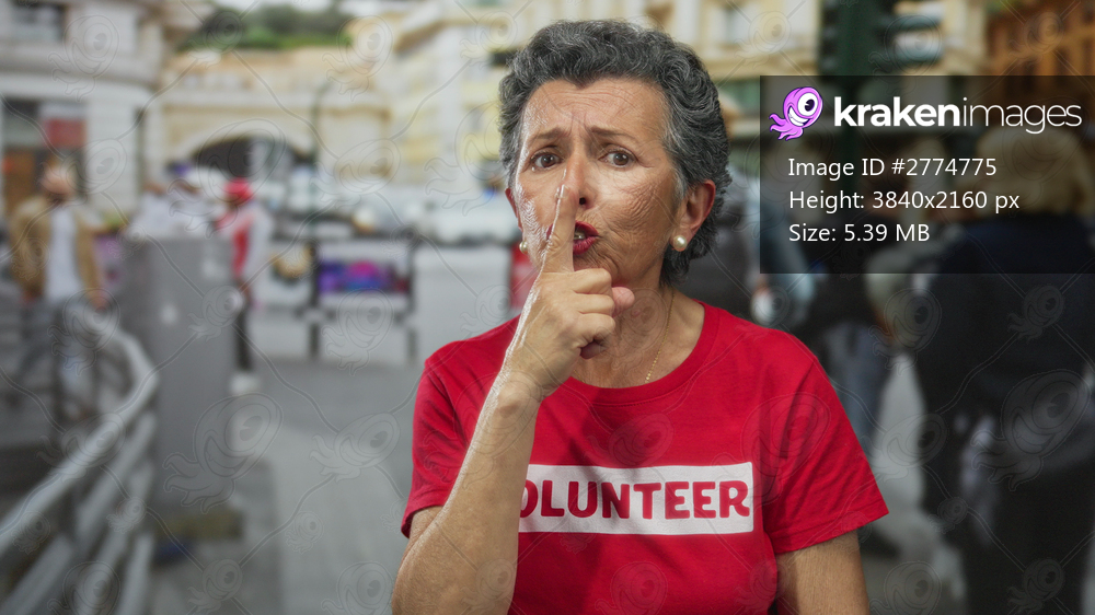 Senior woman with grey hair in a red volunteer shirt gestures quietly on an urban street surrounded by people.