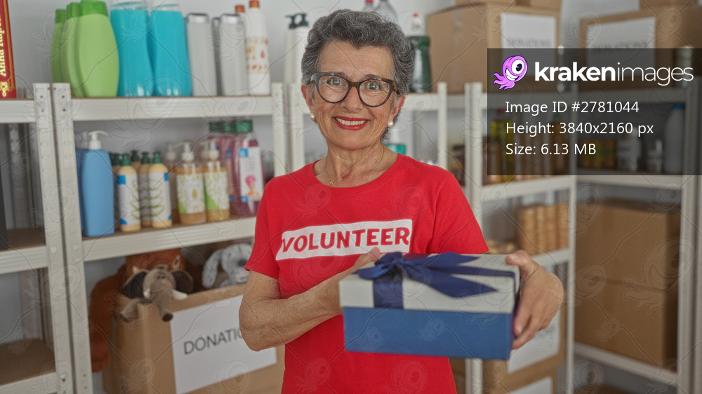 Senior woman with grey hair in a red volunteer shirt holding a blue gift box stands in a donation room filled with various products on shelves.