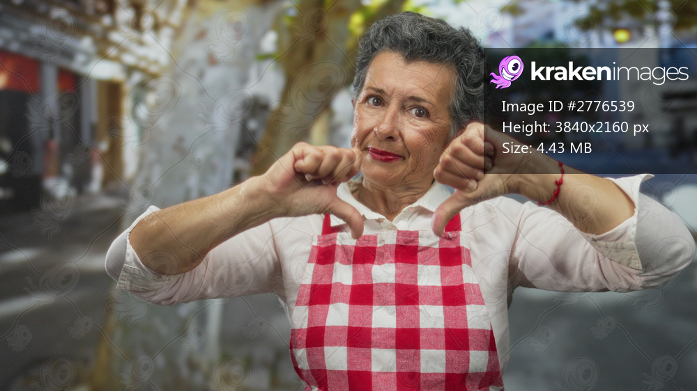Senior woman with grey hair in an apron showing both thumbs down, standing outdoors on a bustling city street.