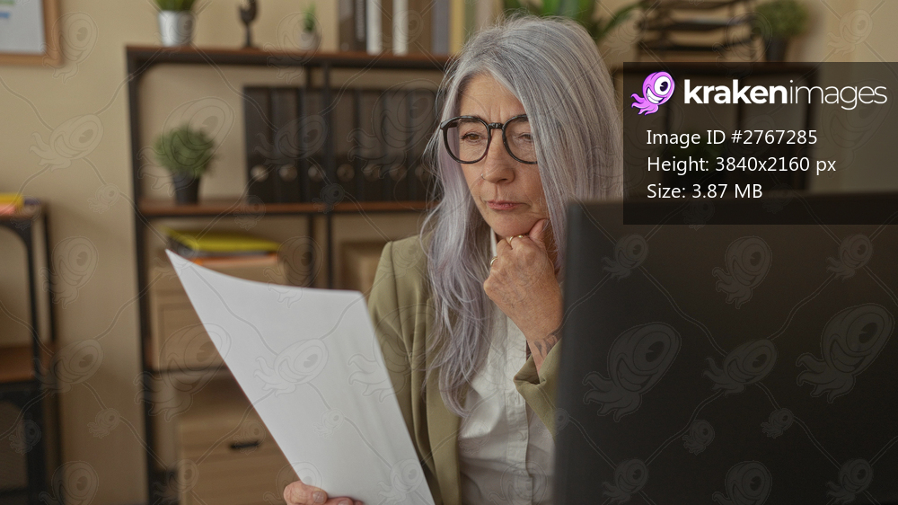 Senior woman with grey hair in an office setting, thoughtfully analyzing documents at her desk, surrounded by shelves and workplace essentials.